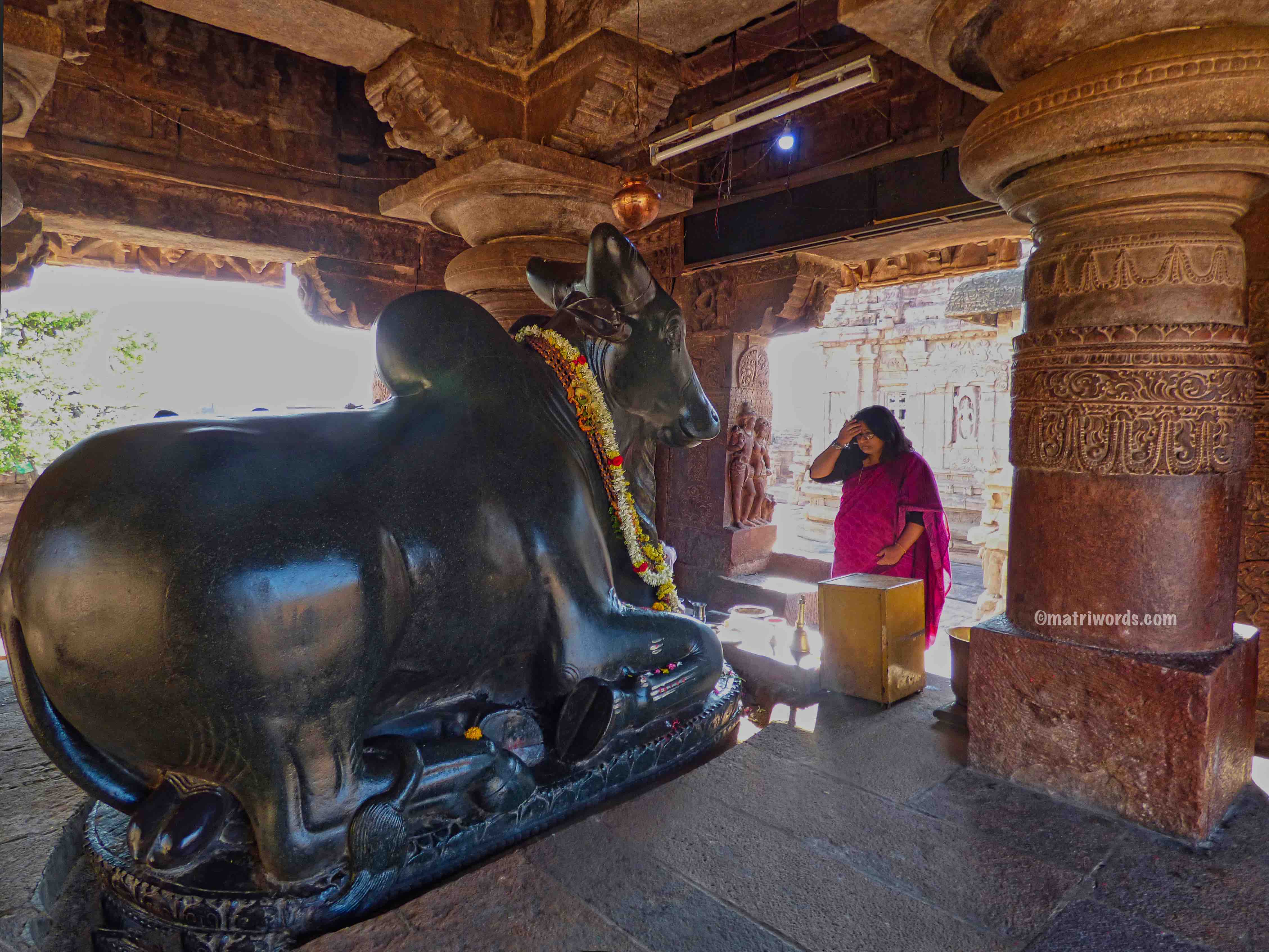 This was one of the first Shiva temples to have a separate mandapa for Nandi. Situated to the east of the temple, this mandapa is a square pavilion open on all four sides, and houses a large image of Nandi on a raised floor. Its flat roof is supported by four pillars; the outer surfaces of the mandapa’s short walls are carved with attendant figures and Kinnara-maithuna couples.