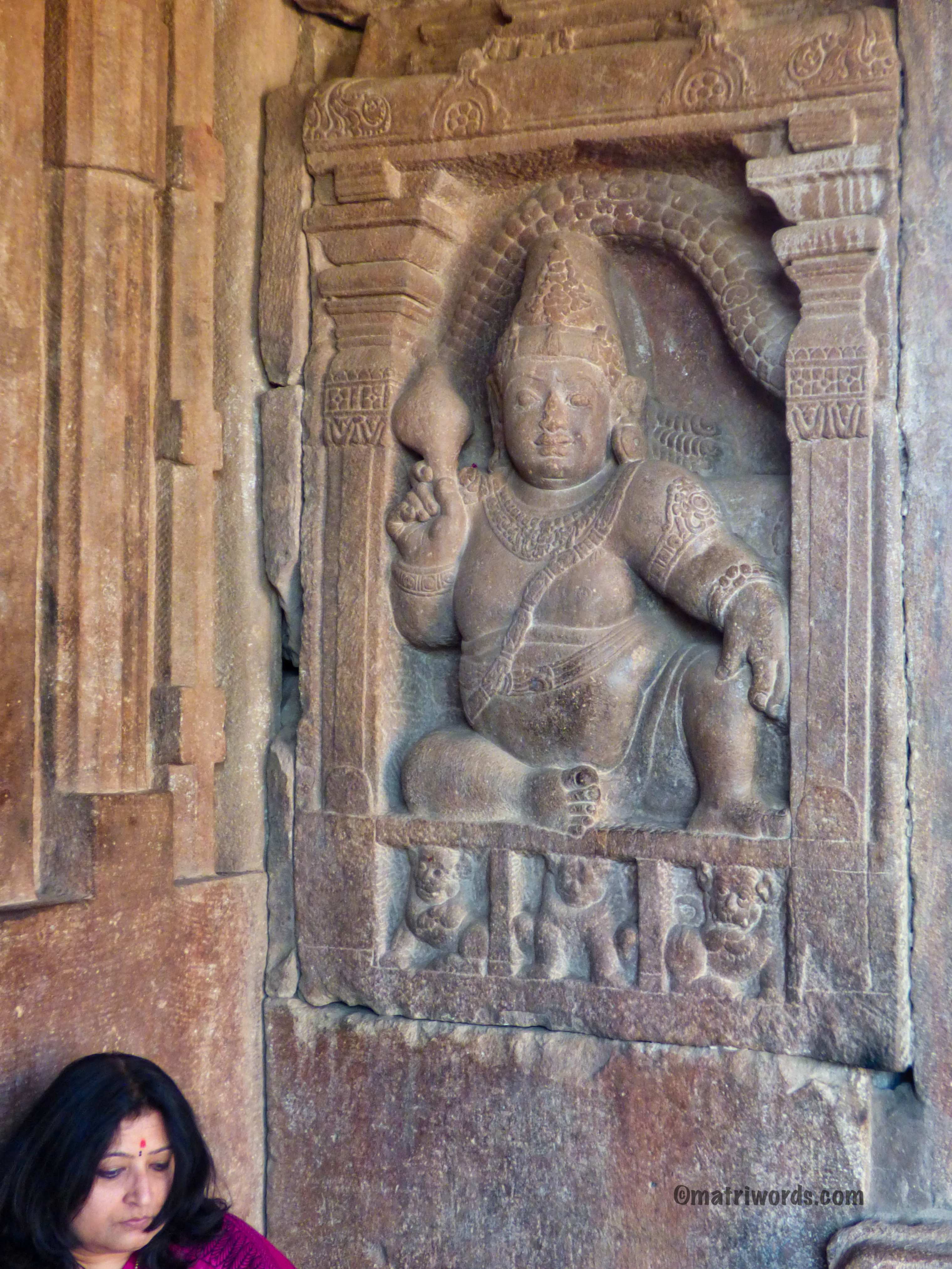 On one wall is seen a sculpture which tells the story of Jatayu figthing with Ravana. The continuous narrative depicted in stone reminds one of the magnificent Trivikrama panel in cave 2 at Badami.