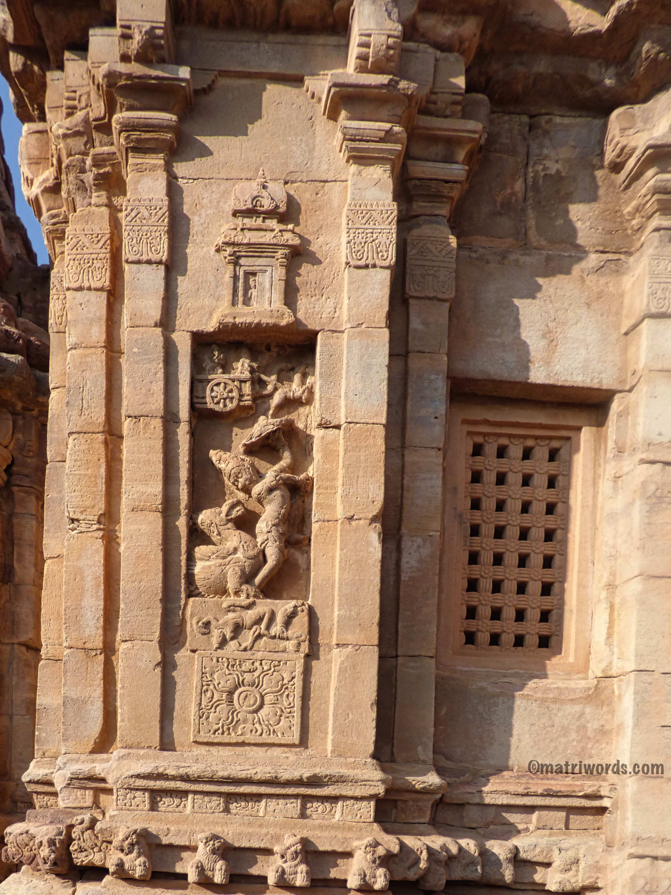 All the projections have niches where we meet both Lord Shiva and Lord Vishnu in their various rūpa-s such as Bhairava, Ardhanarishvara, Narasimha, and Hari-Hara. In the recesses in between the projections are seen perforated windows of various designs.