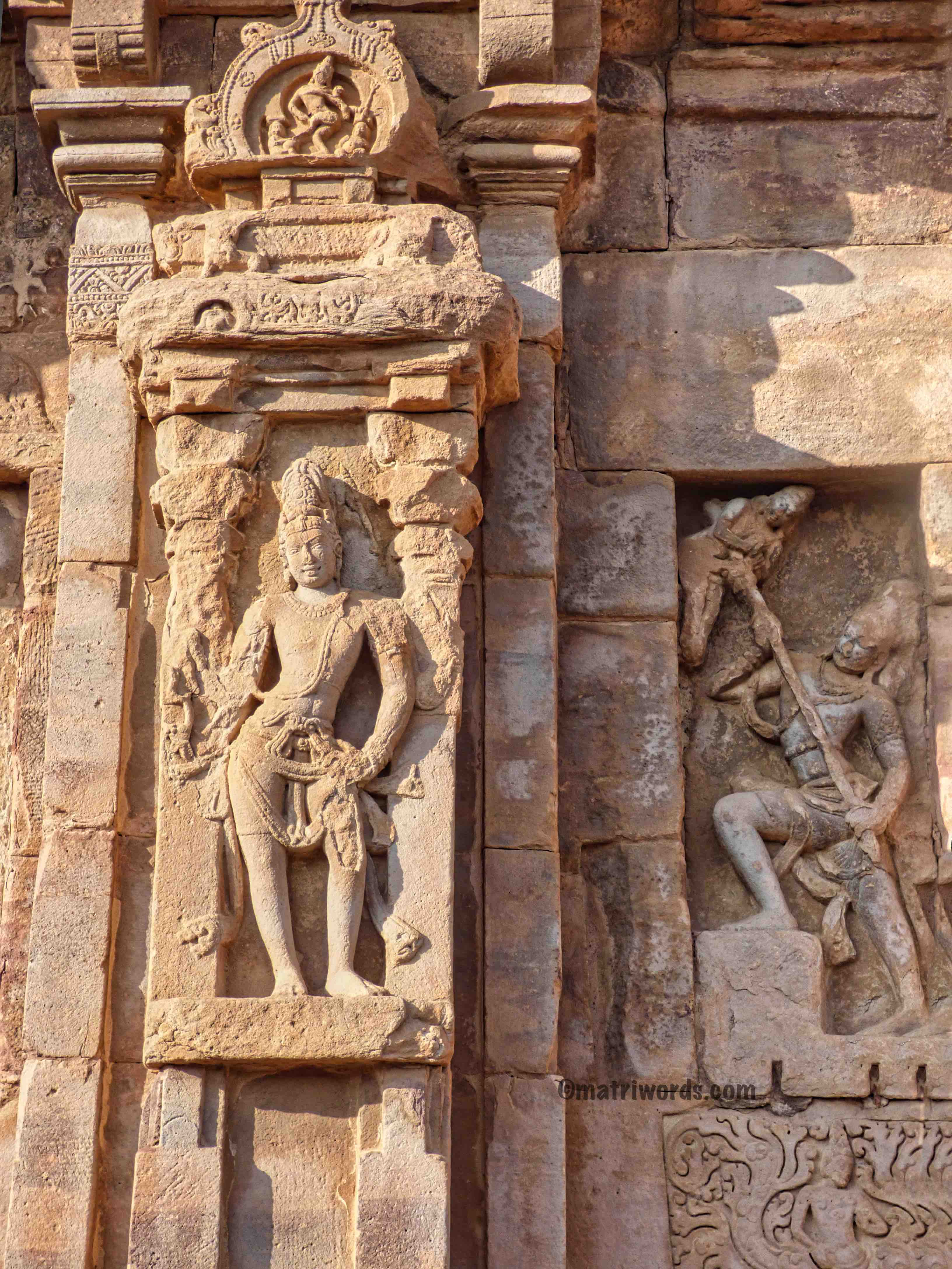 The relaxed yet alert postures of the dwarapala-s are delightful. On some of the exterior pillared walls we also see some sculptures of female celestial beings in graceful postures as well as Maithuna couples.