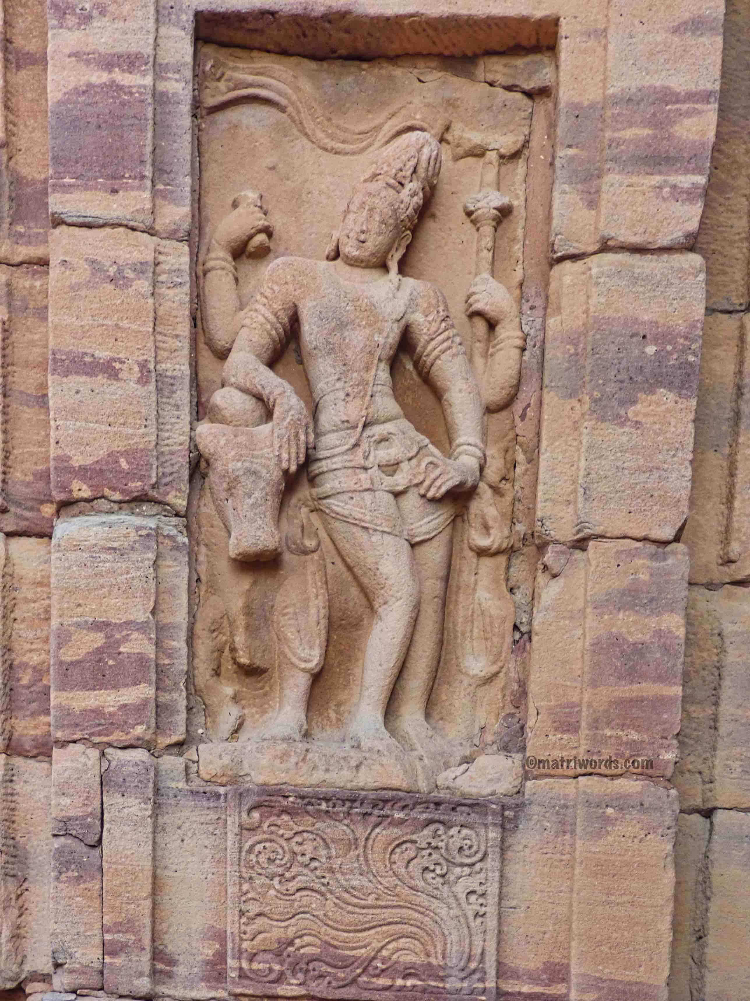 Lord Shiva is seen here emerging from a fiery column of light which is represented as flames on either side of the column. On top of the column to the right can be seen Lord Brahma on his vāhana, the swan, soaring high to trace the highest peak of this column of light. The bottom of the column which is supposed to depict Lord Vishnu tracing the root of the column is, however, badly defaced. A beautifully crafted makara torana adorns the niche.
